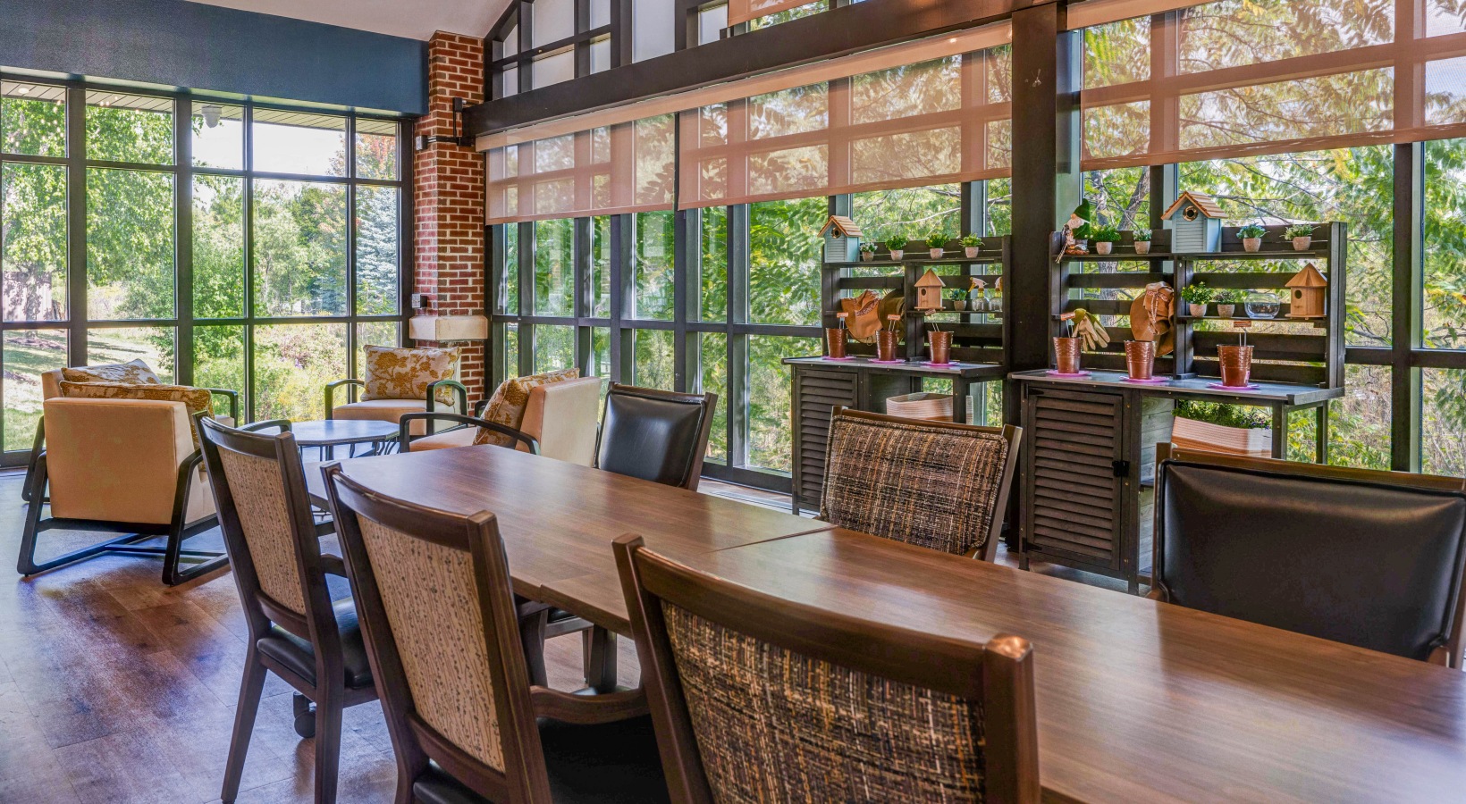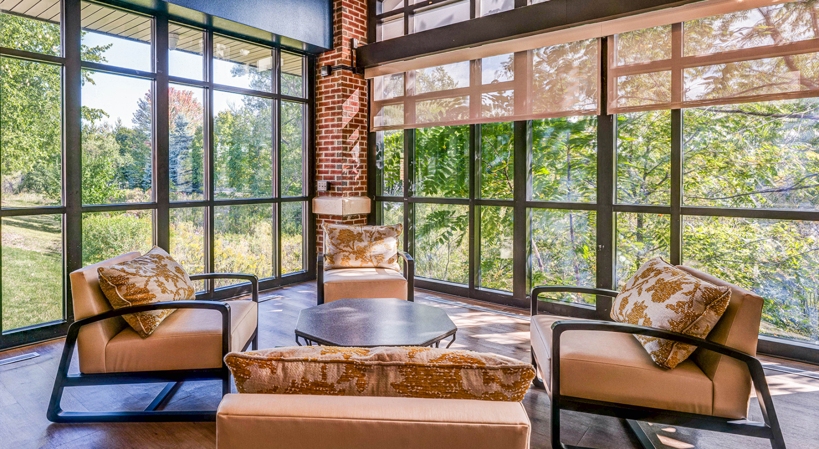 • Room with glass walls and comfy chairs