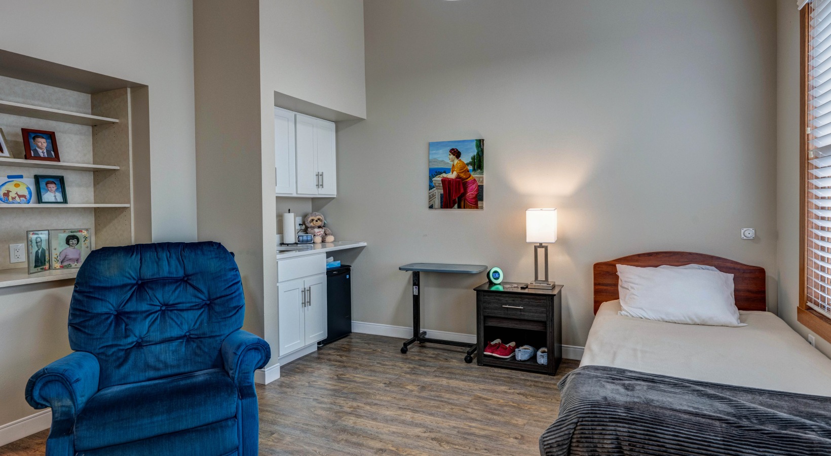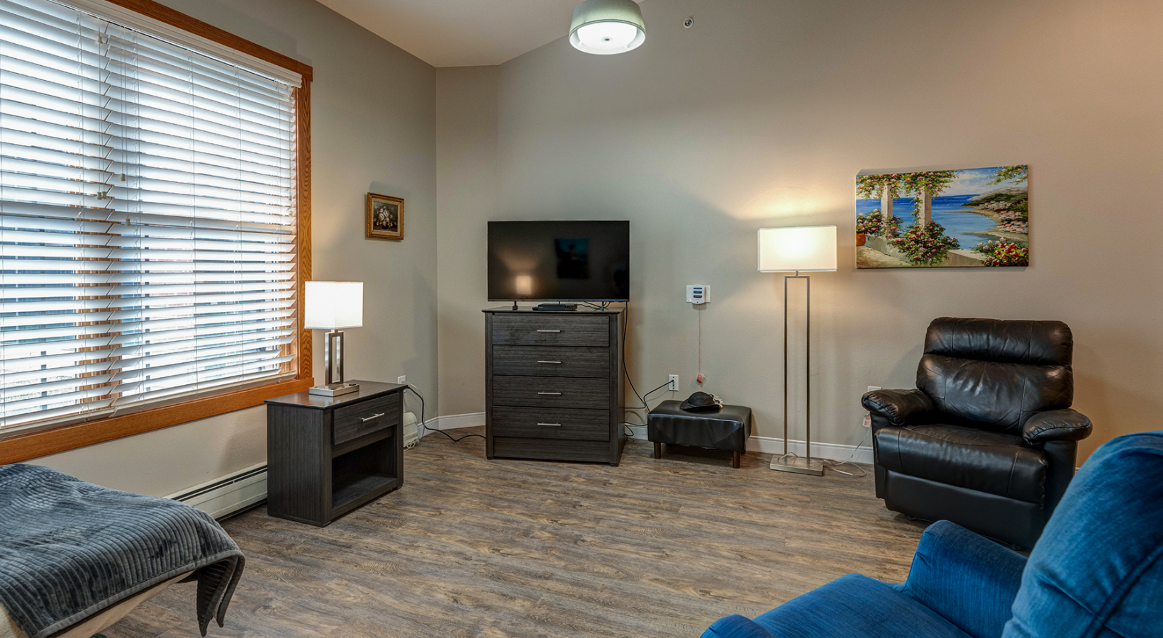 • Bedroom with comfy chairs, dresser, and single bed