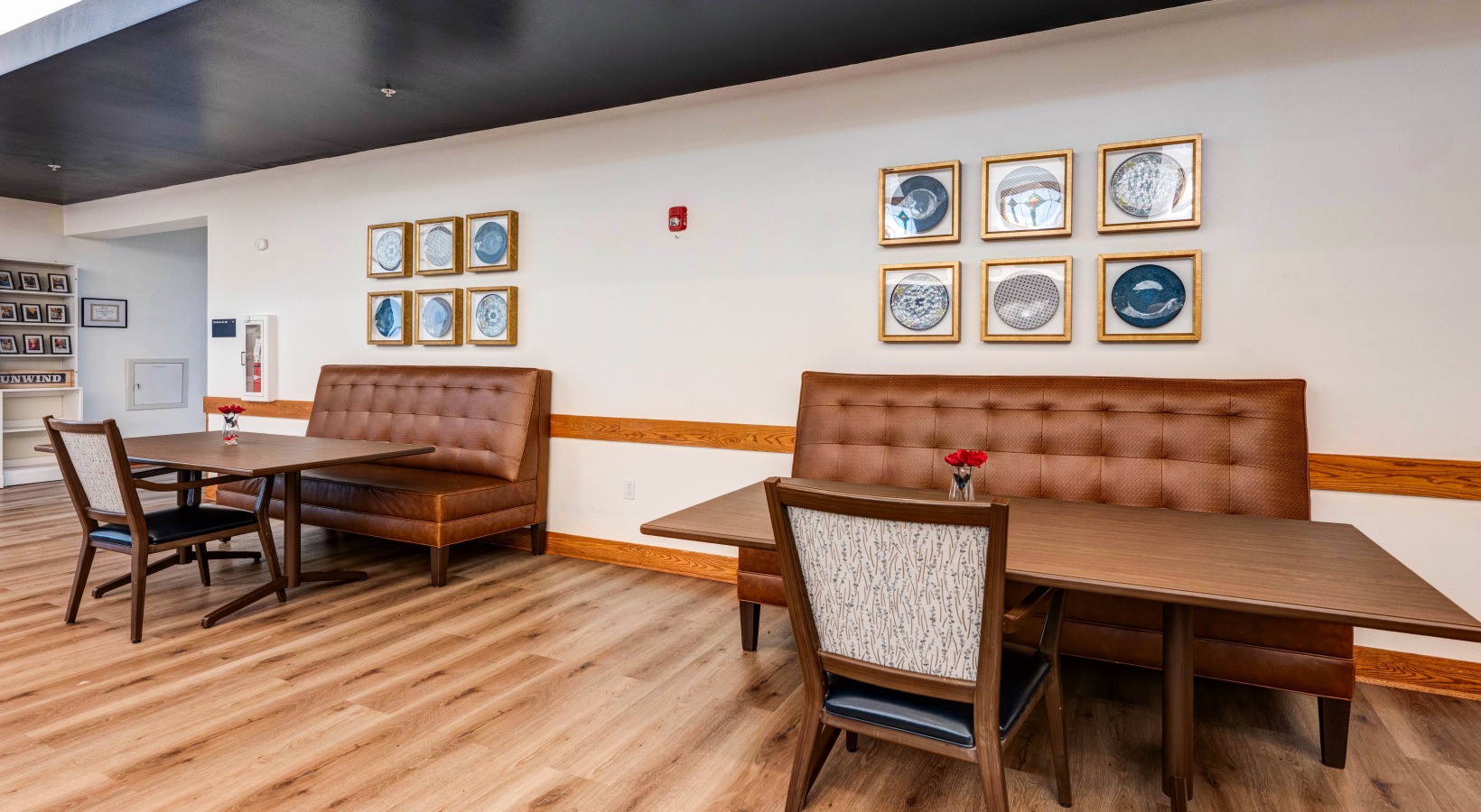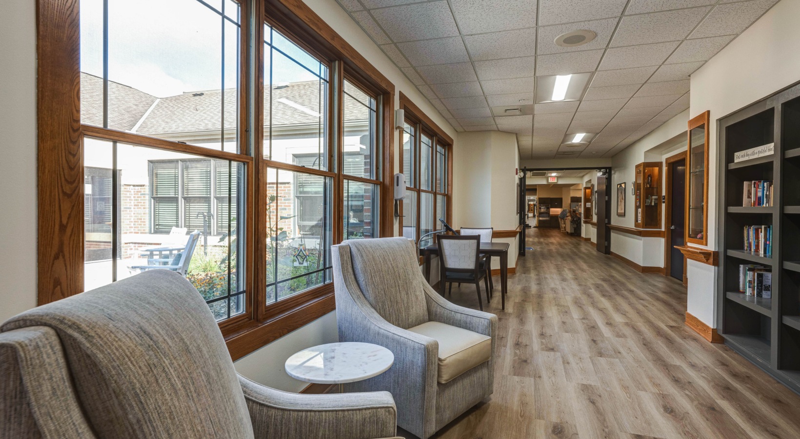 • Hallway with comfy couches and bookshelf
